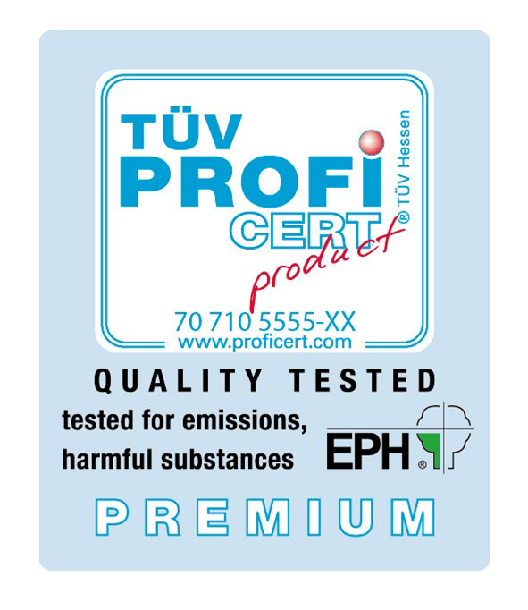 - “TÜV PROFiCERT-product Interior” is a certification procedure for assessing the health impact of VOC emissions from interior products (e.g., floor coverings and sports flooring systems, wall and ceiling coverings, wood-based materials, HPL/CPL, underlayments, and screed coatings).